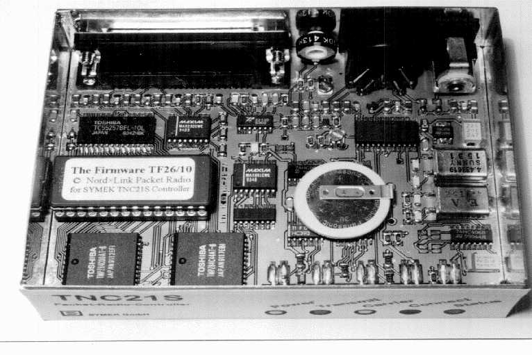 Im TNC21S wird die TF27 oder ähnliche Firmware von Nord><Link e.V. eingesetzt. Das TNC21 ist Soft-warekompatibel zu allen anderen TNC2 Geräten. Dadurch können alle anderen TNC2-Software-EPROMs eingesetzt werden, z.B. die TAPR-EPROMs, Mini-Mailbox-EPROM etc. Das Standard-EPROM im TNC21S ist steckbar und kann leicht gegen eine andere Software ausgetauscht werden. Möglich sind EPROMS vom Typ 27C256 aber auch 27C512 mit zwei verschiedenen Programmen. Über eine Lötbrücke im TNC21 kann dann eines der beiden Programme im 27C512 EPROMs ausgewählt werden.