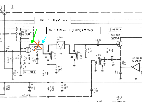 Locate the dual gate FET mixer Q 203. (see photo, under L208). The drain of Q 203 goes originally only to a tap of L 208. You have to carefully cut this trace between Q203 and L208.