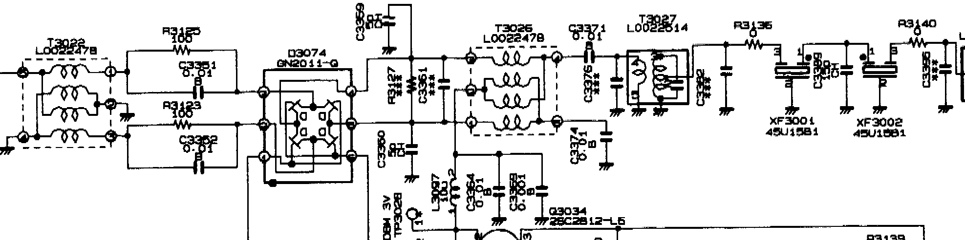 Here you see the transceiver front end: left side the balanced mixer, middle the balun with ist 50 Ohm output and right the transformer which matches the 50 Ohm to the quartz filter input. The IFD has to be inserted in the 50 Ohm signal path between the balun output and the resonant transformer circuit. Remove simply the coupling capacitor C 3371 (10 nF) and connect a 50 ohm coaxial to each end of the removed capacitor.