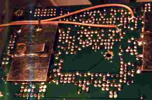At the right side, you find the RF-B unit. Remove all coax connectors and all screws to access the solder side of this board. (see photo).