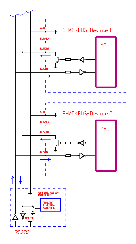 ![]() | SHACKBUS uses 3 wires. Voltage level is 5 Volt (idle) and 0 Volt (data): BUSIN (controller to all devices): normal TTL level signal BUSOUT (devices to controller): TTL open collector signal with pullup BUSGND (common ground wire) |