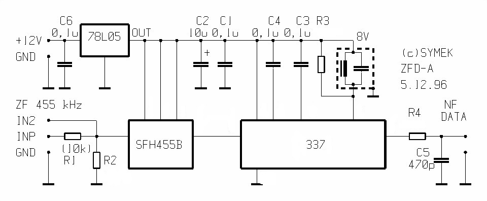 Supply: 8 to 20 Volt, 6 mA; bandwidth of demodulators: approx. 25 kHz, output voltage (AF) 0,8 Vss at 3 kHz FM deviation (0,14 Volt/kHz). Audio-bandwidth: > 10 kHz. Size: 36x36x20 mm